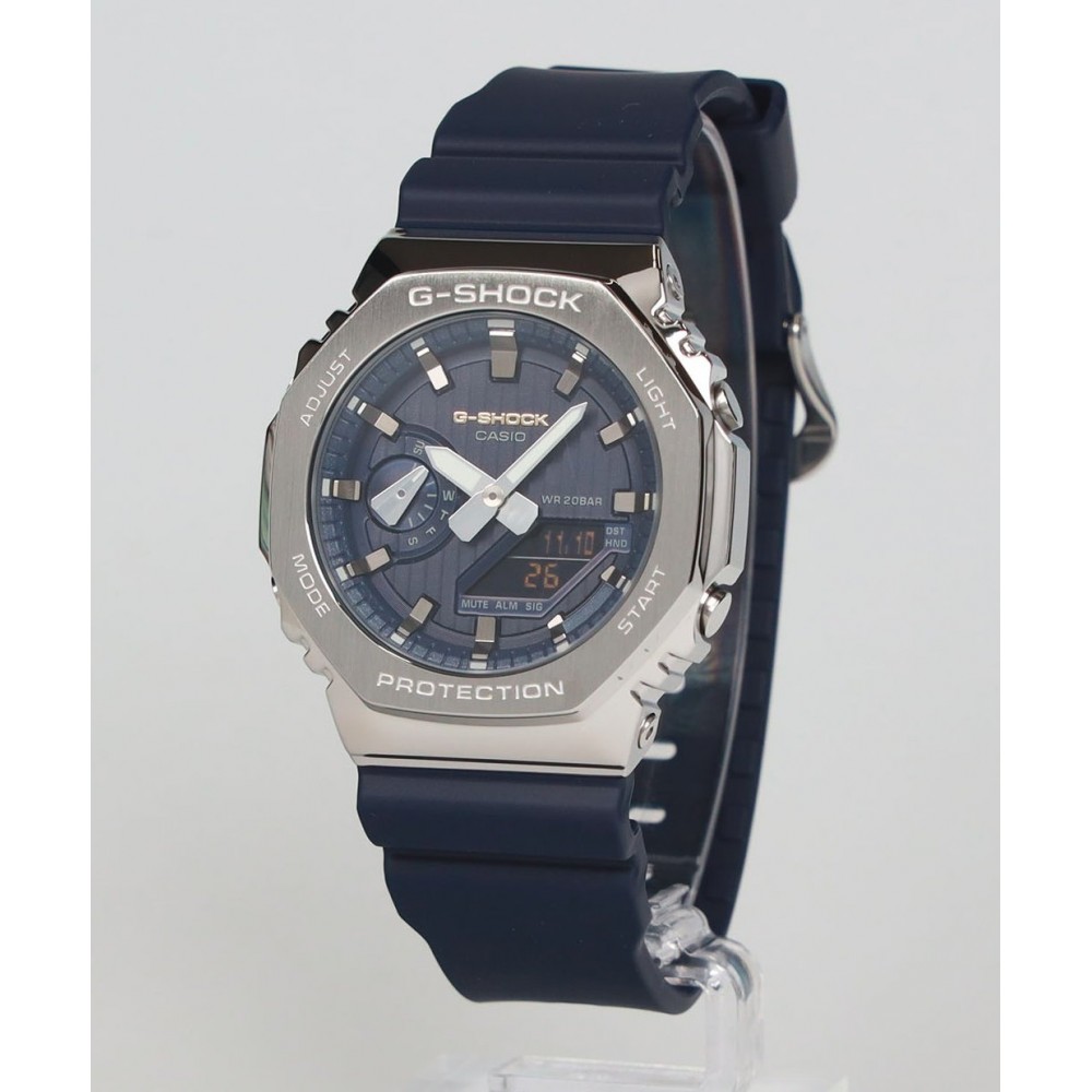 Casio G-Shock Analog-Digital PRECIOUS HEART SELECTION 2025 GM-2110SH-2AJF - men's watch made by Casio. It is equipped with Japanese quartz movement and 5611 calibre. Resin, stainless steel case of round shape. Case dimensions are 44.4 mm. in diameter and 11.8 mm. in thickness. The dial of this Casio watch is lcd, dark blue. Display type: analog-digital. This timepiece has mineral glass. Resin (biomass plastic) band, band color: dark blue. 200 m. water resistance. The watch is from G-Shock collection. The following features are equipped: glowing hands, world time, countdown timer, backlight, perpetual calendar, chronograph, alarm, date, day, month.