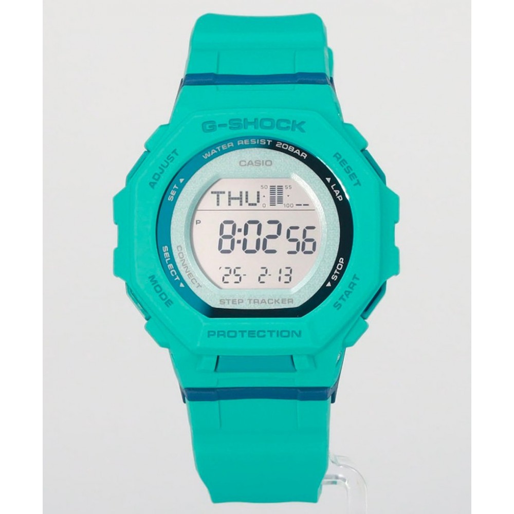 Casio G-Shock Digital Women GMD-B300SC-2JF - ladies watch produced by Casio. It is equipped with Japanese quartz movement and 3567 calibre. Resin, resin (biomass) case of round shape. Case dimensions are 43.8 mm. in diameter and 12 mm. in thickness. The dial of this Casio watch is lcd. Display type: digital. This timepiece has mineral glass. Resin (biomass plastic) band, band color: blue. 200 m. water resistance. The watch is from G-Shock collection. The following features are equipped: bluetooth, step count, world time, dual time, countdown timer, backlight, perpetual calendar, chronograph, alarm, date, day, month.