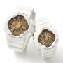 Casio G-Shock G Presents Lover's Collection 2022 Limited Model LOV-22A-7AJR - men's, ladies watch made by Casio. It has Japanese quartz movement and 5146, 5338 calibre. Resin case of round shape. Case dimensions are 51.2, 43.4 mm. in diameter and 16.9, 15.8 mm. in thickness. The dial of this Casio watch is lcd, gold. Display type: analog-digital. This timepiece has mineral glass. Resin band, band color: white. 200, 100 m. water resistance. The watch is from G-Shock, Baby-G collections. The following features are equipped: glowing hands, antimagnetic, world time, countdown timer, backlight, perpetual calendar, chronograph, alarm, date, day, month.