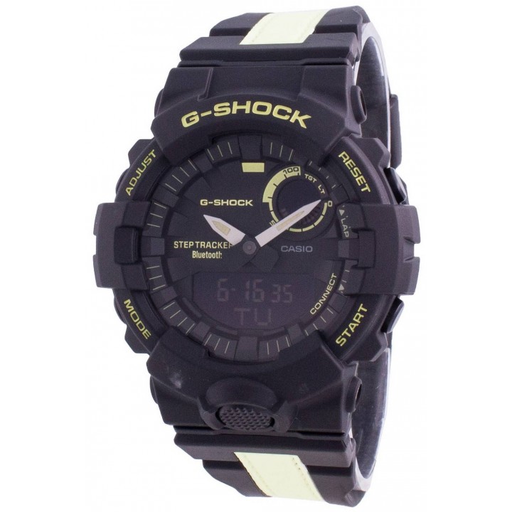 Casio G-Shock G-Squad GBA-800LU-1A1JF - men's watch produced by Casio. It is equipped with Japanese quartz movement and 5554 calibre. Polymer case of round shape. Case dimensions are 48.6 mm. in diameter and 15.5 mm. in thickness. The dial of this Casio watch is lcd, black. Display type: analog-digital. This timepiece has mineral glass. Polymer band, band color: black, green. 200 m. water resistance. The watch is from G-Shock collection. The following features are equipped: glowing hands, bluetooth, dual time, chronograph, countdown timer, alarm, perpetual calendar, backlight, date, day, month.