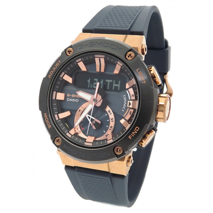Casio G-Shock G-Steel Carbon Core Guard GST-B200G-2AJF - men's watch produced by Casio. It has Japanese solar quartz movement and 5608 calibre. Carbon, stainless steel, gold plated case of round shape. Case dimensions are 49.2 mm. in diameter and 14.5 mm. in thickness. The dial of this Casio watch is lcd, blue. Display type: analog-digital. This timepiece has mineral glass. Polymer band, band color: blue. 200 m. water resistance. The watch is from G-Shock collection. The following features are equipped: glowing hands, bluetooth, world time, chronograph, countdown timer, alarm, power reserve indicator, perpetual calendar, backlight, date, day, month.