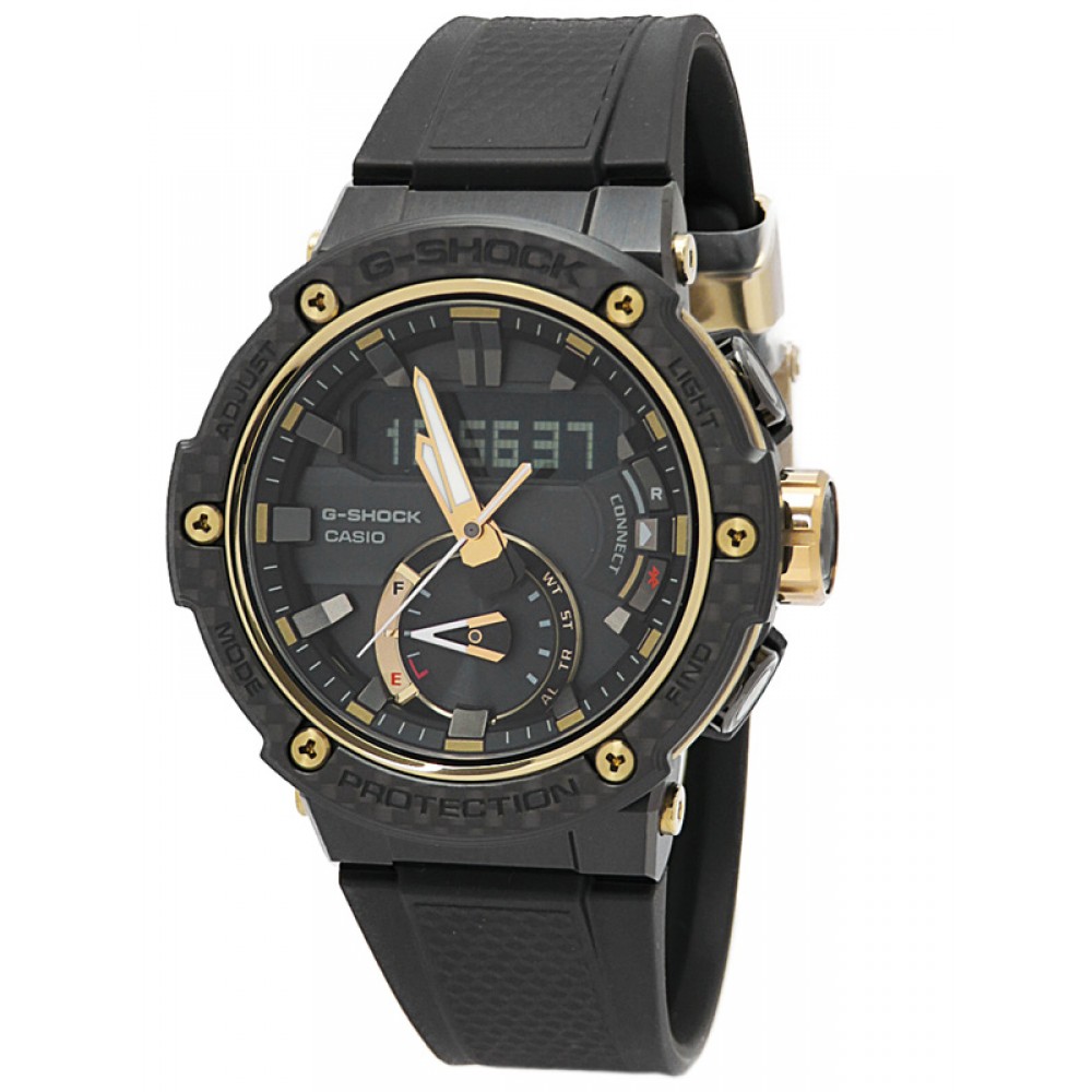 Casio G-Shock G-Steel Carbon Core Guard GST-B200X-1A9JF - men's watch produced by Casio. It is equipped with Japanese solar quartz movement and 5608 calibre. Carbon, stainless steel, gold plated, hard coating case of round shape. Case dimensions are 49.4 mm. in diameter and 14.3 mm. in thickness. The dial of this Casio watch is lcd, black. Display type: analog-digital. This timepiece has sapphire, antireflection coating glass. Polymer band, band color: black. 200 m. water resistance. The watch is from G-Shock collection. The following features are equipped: glowing hands, bluetooth, world time, chronograph, countdown timer, alarm, power reserve indicator, perpetual calendar, backlight, date, day, month.