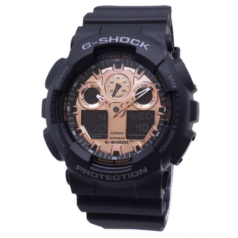 Casio G-Shock GA-100MMC-1AJF - men's watch manufactured by Casio. It is equipped with Japanese quartz movement and 5081 calibre. Polymer case of round shape. Case dimensions are 51.2 mm. in diameter and 16.9 mm. in thickness. The dial of this Casio watch is lcd, gold. Display type: analog-digital. This timepiece has mineral glass. Polymer band, band color: black. 200 m. water resistance. The watch is from G-Shock collection. The following features are equipped: antimagnetic, world time, chronograph, countdown timer, alarm, perpetual calendar, backlight, date, day, month.