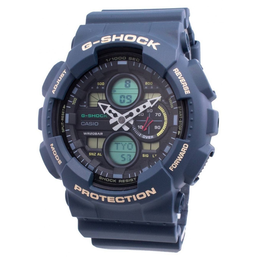 Casio G-Shock GA-140-2AJF - men's watch manufactured by Casio. It is equipped with Japanese quartz movement and 5612 calibre. Polymer case of round shape. Case dimensions are 51.2 mm. in diameter and 16.9 mm. in thickness. The dial of this Casio watch is black, lcd. Display type: analog-digital. This timepiece has mineral glass. Polymer band, band color: blue. 200 m. water resistance. The watch is from G-Shock collection. The following features are equipped: antimagnetic, world time, chronograph, countdown timer, alarm, perpetual calendar, backlight, date, day, month.