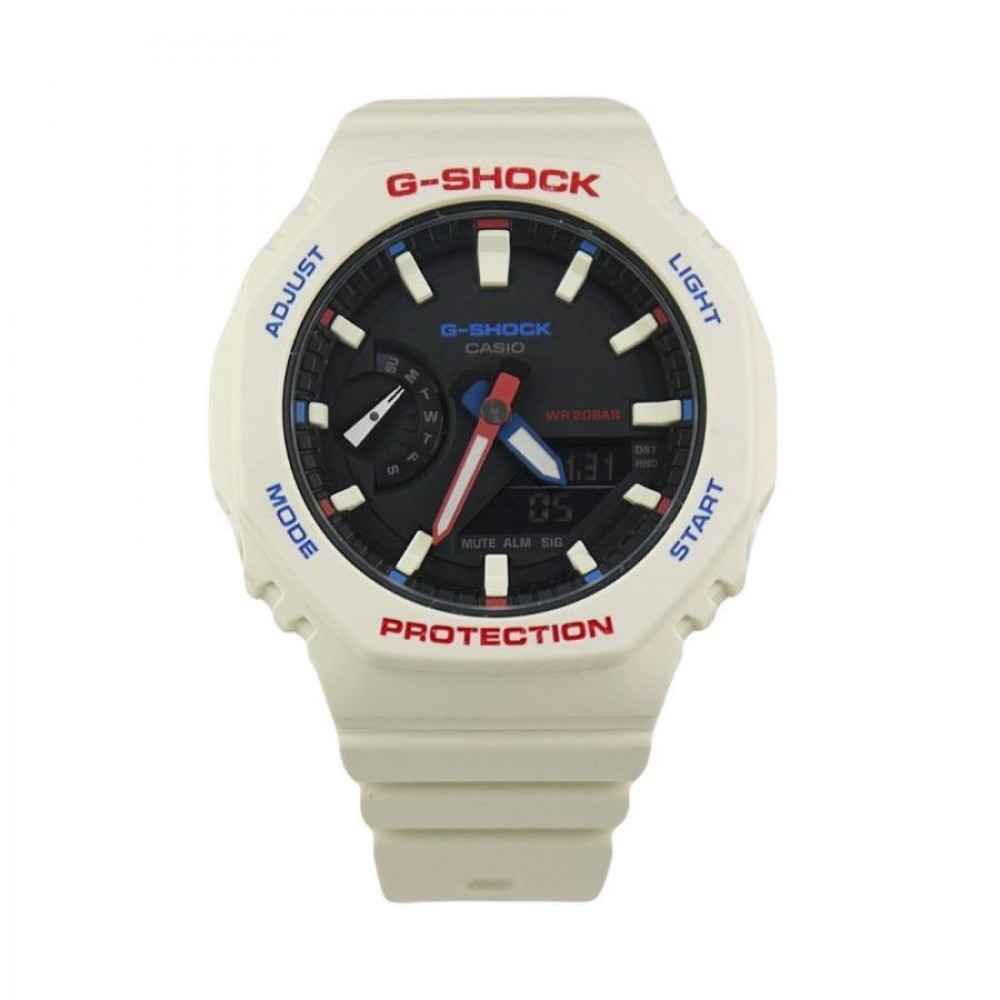 Casio G-Shock GMA-S2100WT-7A1JF - men's watch manufactured by Casio. It is equipped with Japanese quartz movement and 5611 calibre. Polymer, carbon case of round shape. Case dimensions are 42.9 mm. in diameter and 11.2 mm. in thickness. The dial of this Casio watch is lcd, black. Display type: analog-digital. This timepiece has mineral glass. Polymer band, band color: beige. 200 m. water resistance. The watch is from G-Shock collection. The following features are equipped: glowing hands, world time, countdown timer, backlight, perpetual calendar, chronograph, alarm, date, day, month.