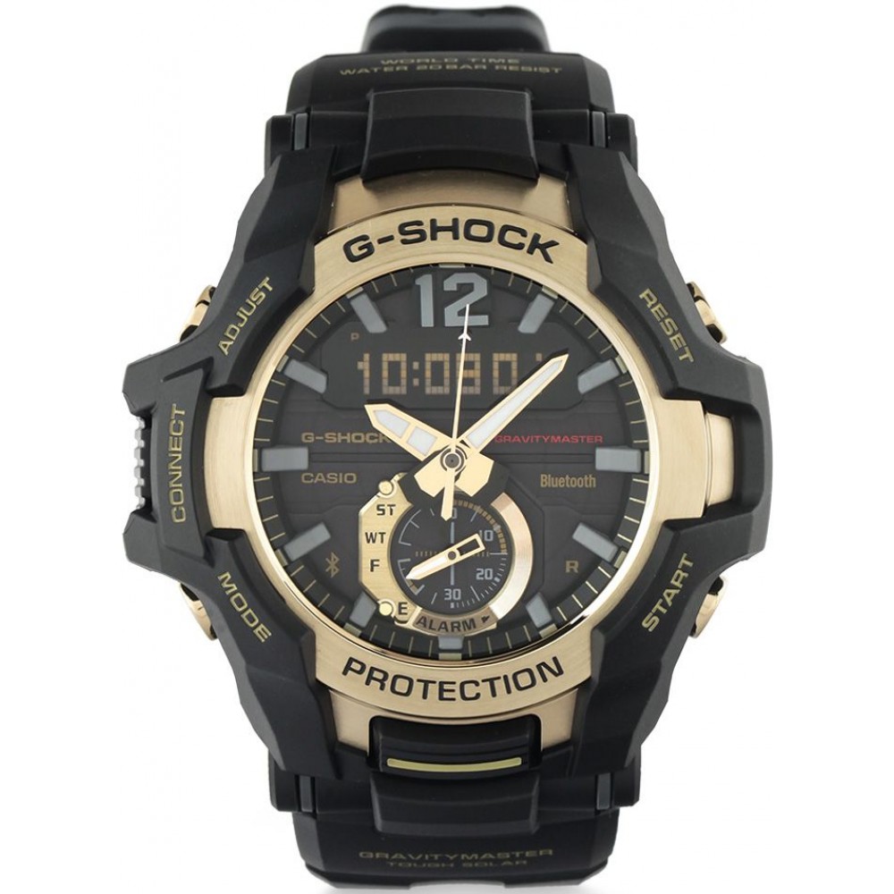 CASIO G-SHOCK GR-B100GB-1AJF - men's watch made by Casio. It has Japanese solar quartz movement and 5536 calibre. Polymer, stainless steel, gold plated case of round shape. Case dimensions are 53.8 mm. in diameter and 17.3 mm. in thickness. The dial of this Casio watch is black, lcd, gold. Display type: analog-digital. This timepiece has mineral glass. Polymer band, band color: black. 200 m. water resistance. The watch is from G-Shock collection. The following features are equipped: glowing hands, glowing markers, bluetooth, world time, chronograph, countdown timer, alarm, power reserve indicator, perpetual calendar, backlight, date, day, month.