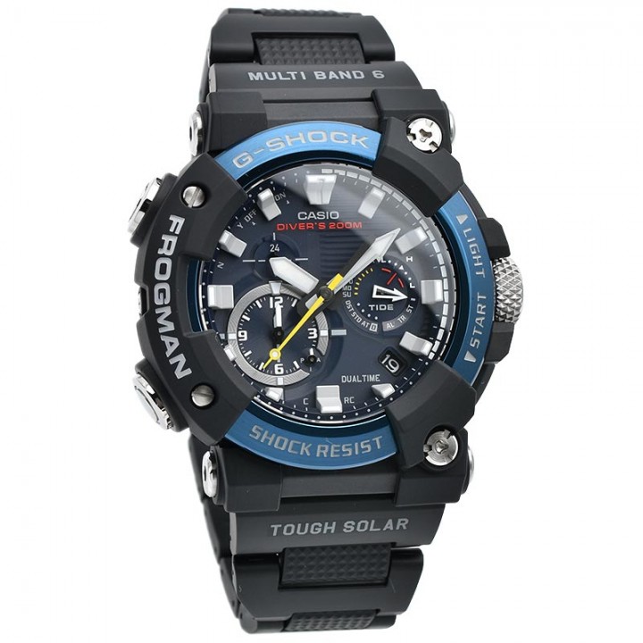 Casio G-Shock Master Of G Sea Frogman GWF-A1000C-1AJF - men's watch made by Casio. It is equipped with Japanese solar quartz movement and 5623 calibre. Polymer, stainless steel, hard coating case of round shape. Case dimensions are 53.3 mm. in diameter and 19.7 mm. in thickness. The dial of this Casio watch is navy. Display type: analog. This timepiece has sapphire, antireflection coating glass. Polymer, stainless steel, hard coating band, band color: black. 200 m. water resistance. The watch is from G-Shock collection. The following features are equipped: antimagnetic, bluetooth, glowing hands, glowing markers, screw-down crown, radio controlled, chronograph, alarm, backlight, date, day, dual time, countdown timer, perpetual calendar.