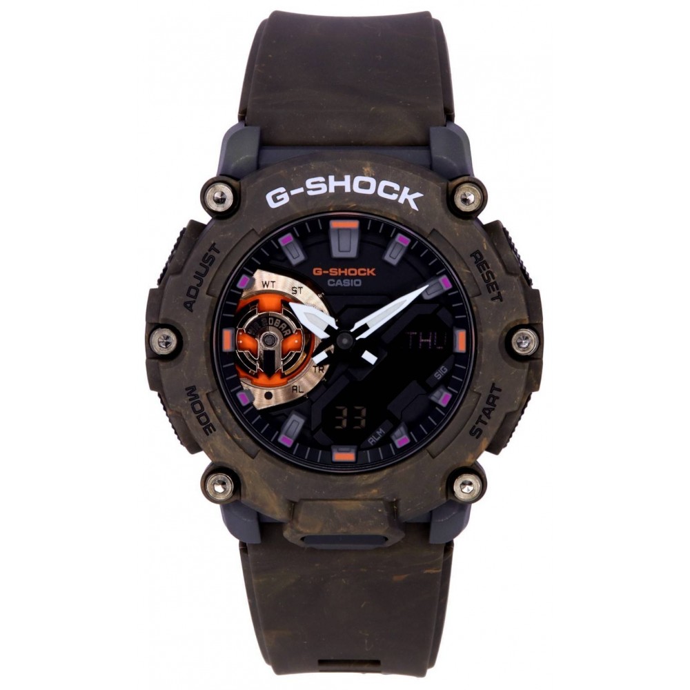 Casio G-Shock Mystic Forest GA-2200MFR-5AJF - men's watch made by Casio. It has Japanese quartz movement and 5674 calibre. Polymer, carbon case of round shape. Case dimensions are 47.1 mm. in diameter and 13.1 mm. in thickness. The dial of this Casio watch is lcd, black. Display type: analog-digital. This timepiece has mineral glass. Polymer band, band color: brown. 200 m. water resistance. The watch is from G-Shock collection. The following features are equipped: glowing hands, world time, countdown timer, backlight, perpetual calendar, chronograph, alarm, date, day.