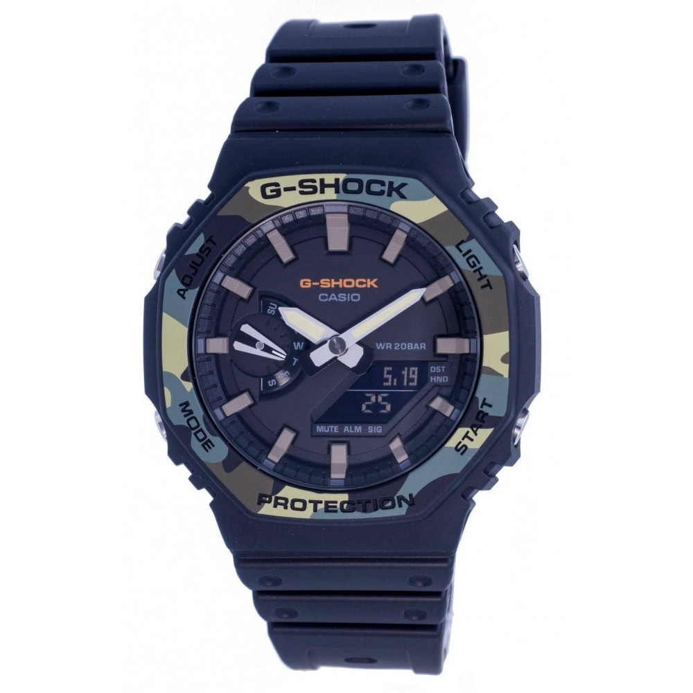 Casio G-Shock Utility Color GA-2100SU-1AJF - men's watch manufactured by Casio. It is equipped with Japanese quartz movement and 5611 calibre. Polymer, carbon case of round shape. Case dimensions are 45.4 mm. in diameter and 11.8 mm. in thickness. The dial of this Casio watch is lcd, black. Display type: analog-digital. This timepiece has mineral glass. Polymer band, band color: black. 200 m. water resistance. The watch is from G-Shock collection. The following features are equipped: glowing hands, world time, chronograph, countdown timer, alarm, perpetual calendar, backlight, date, day, month.