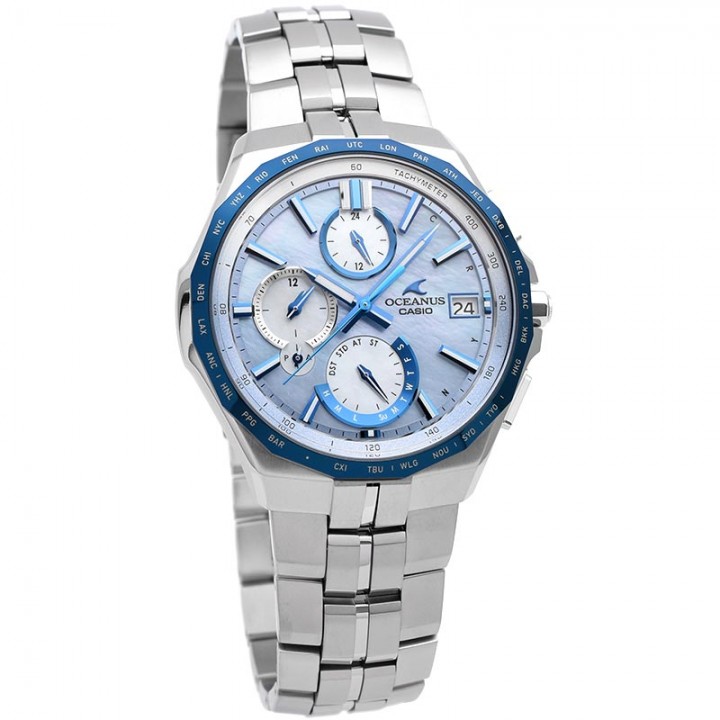 Casio Oceanus Manta Indigo Limited Model OCW-S5000APA-2AJF - men's watch made by Casio. It has Japanese solar quartz movement and 5603 calibre. Titanium, hard coating case of round shape. Case dimensions are 42.3 mm. in diameter and 9.3 mm. in thickness. The dial of this Casio watch is mother of pearl. Display type: analog. This timepiece has sapphire, antireflection coating glass. Titanium, hard coating band, band color: silver. 100 m. water resistance. The watch is from Oceanus collection. The following features are equipped: radio controlled, glowing hands, glowing markers, bluetooth, world time, perpetual calendar, date, day, chronograph, power reserve indicator, limited edition.