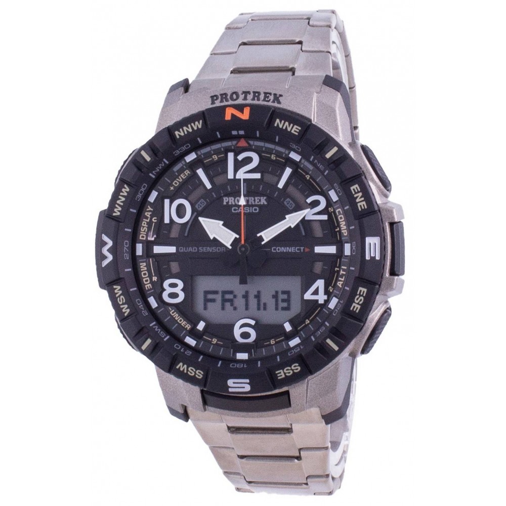 Casio ProTrek Climber Line PRT-B50T-7JF - men's watch manufactured by Casio. It has Japanese quartz movement and 5601 calibre. Polymer case of round shape. Case dimensions are 50.8 mm. in diameter and 15.8 mm. in thickness. The dial of this Casio watch is lcd, black. Display type: analog-digital. This timepiece has mineral glass. Titanium band, band color: silver. 100 m. water resistance. The watch is from Pro Trek collection. The following features are equipped: bluetooth, compass, barometer, altimeter, thermometer, step count, world time, chronograph, countdown timer, alarm, perpetual calendar, cold resistance, backlight, date, day, month.