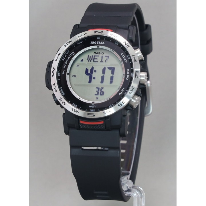 Casio Protrek Climber Line PRW-35-1AJF - men's watch manufactured by Casio. It is equipped with Japanese solar quartz movement and 3490 calibre. Resin (biomass), stainless steel case of round shape. Case dimensions are 44.6 mm. in diameter and 13 mm. in thickness. The dial of this Casio watch is lcd. Display type: digital. This timepiece has mineral glass. Resin (biomass plastic) band, band color: black. 100 m. water resistance. The watch is from Pro Trek collection. The following features are equipped: radio controlled, altimeter, barometer, compass, thermometer, cold resistance, world time, chronograph, alarm, backlight, power reserve indicator, countdown timer, perpetual calendar, date, day.