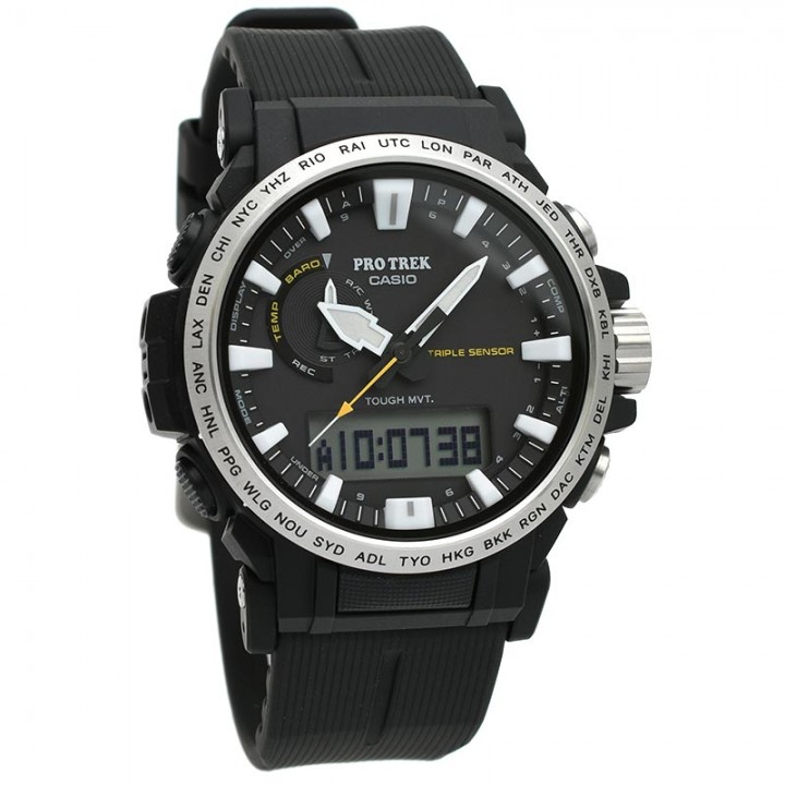 Casio Protrek Climber Line PRW-61-1AJF - men's watch made by Casio. It has Japanese solar quartz movement and 5673 calibre. Polymer, stainless steel case of round shape. Case dimensions are 47.4 mm. in diameter and 14.7 mm. in thickness. The dial of this Casio watch is lcd, black. Display type: analog-digital. This timepiece has mineral glass. Polymer band, band color: black. 100 m. water resistance. The watch is from Pro Trek collection. The following features are equipped: cold resistance, radio controlled, altimeter, barometer, compass, thermometer, screw-down crown, glowing markers, glowing hands, world time, countdown timer, backlight, perpetual calendar, power reserve indicator, chronograph, alarm, date, day, month.
