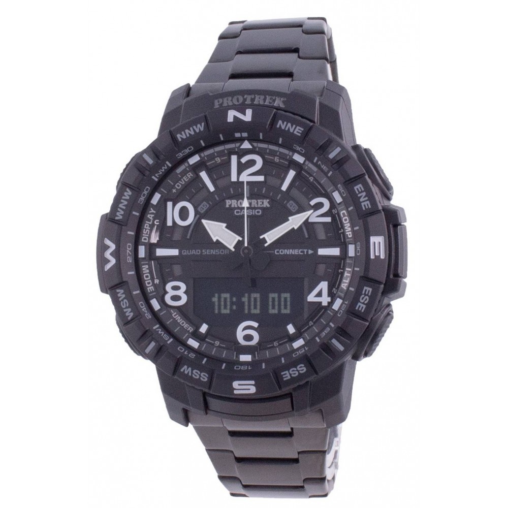 Casio ProTrek PRT-B50YT-1JF - men's watch produced by Casio. It has Japanese quartz movement and 5601 calibre. Polymer case of round shape. Case dimensions are 50.8 mm. in diameter and 15.8 mm. in thickness. The dial of this Casio watch is lcd, black. Display type: analog-digital. This timepiece has mineral glass. Titanium, hard coating band, band color: black. 100 m. water resistance. The watch is from Pro Trek collection. The following features are equipped: bluetooth, compass, barometer, altimeter, thermometer, step count, world time, chronograph, countdown timer, alarm, perpetual calendar, cold resistance, backlight, date, day, month.
