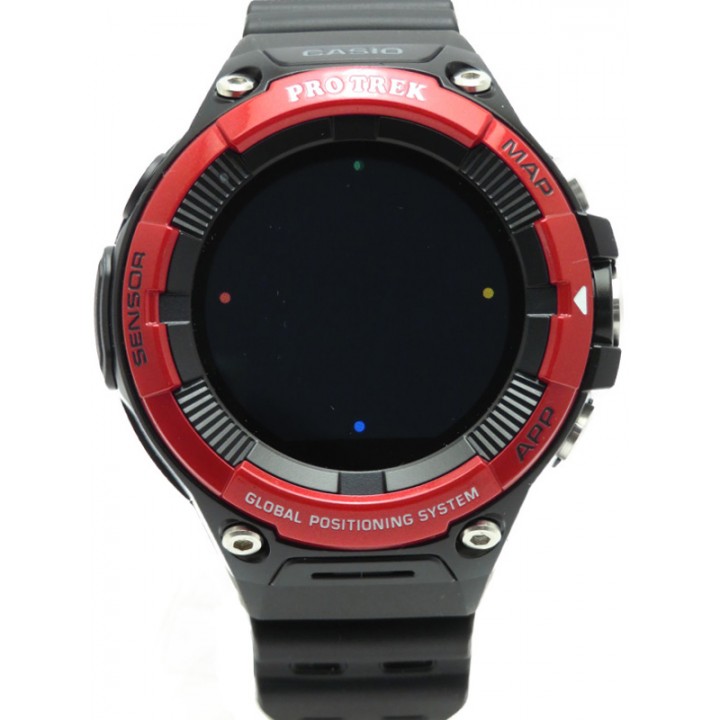 Casio Protrek Smart Outdoor Watch WSD-F21HR-RD - men's watch made by Casio. It has Japanese quartz movement. Polymer case of round shape. Case dimensions are 57.7 mm. in diameter and 16.8 mm. in thickness. The dial of this Casio watch is lcd. Display type: digital. This timepiece has mineral glass. Polymer band, band color: black. 50 m. water resistance. The watch is from Pro Trek collection. The following features are equipped: gps, date, day, perpetual calendar, heart rate monitor, bluetooth, cold resistance, altimeter, barometer, compass.