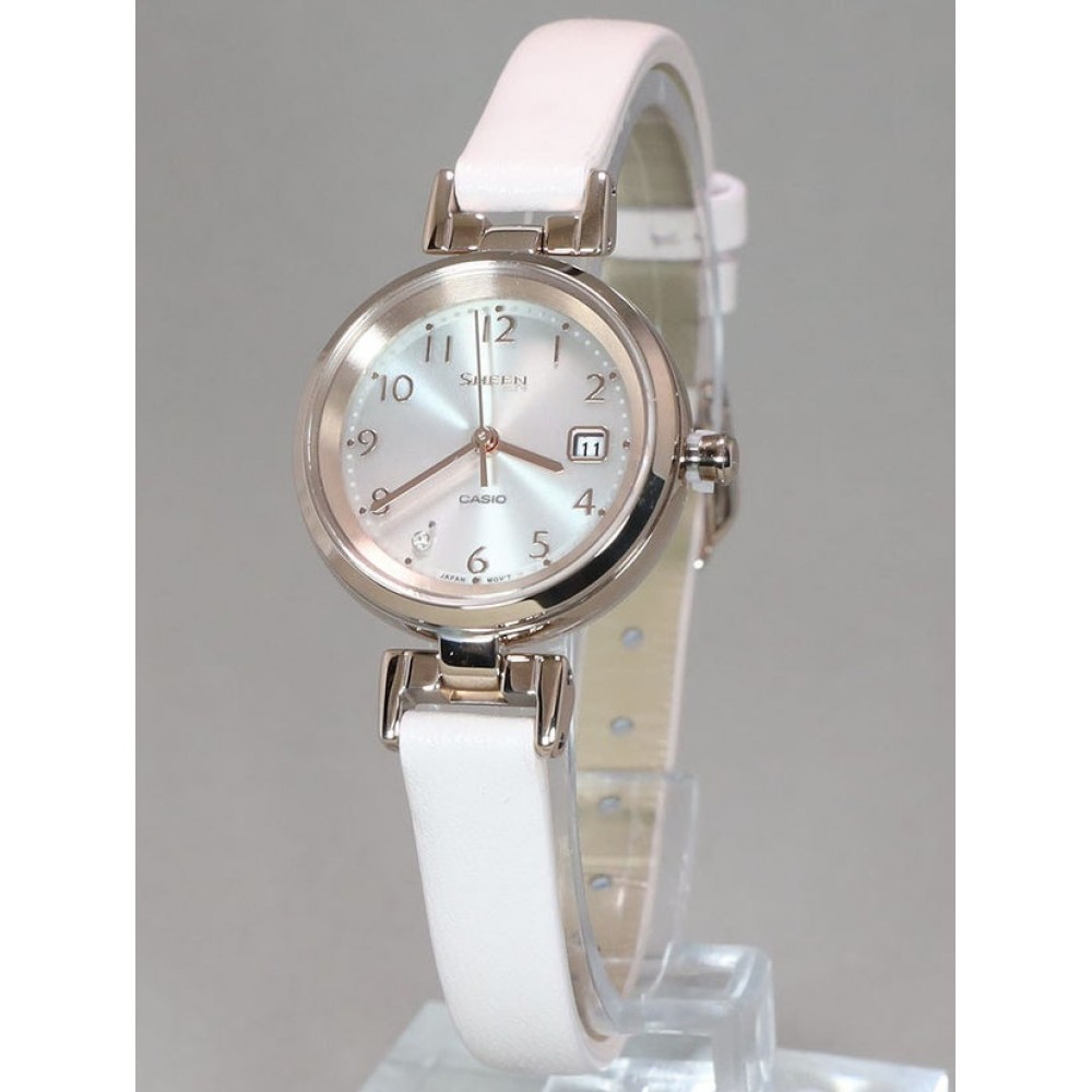 Casio Sheen SHS-D200CGL-4AJF - ladies watch made by Casio. It is equipped with Japanese solar quartz movement and 5617 calibre. Stainless steel, gold plated case of round shape. Case dimensions are 26.5 mm. in diameter and 8 mm. in thickness. The dial of this Casio watch is silver. Display type: analog. This timepiece has sapphire, antireflection coating glass. Leather band, band color: pink. 50 m. water resistance. The watch is from Sheen collection. The following features are equipped: date, crystal set.