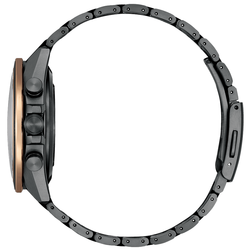 Citizen Attesa ACT Line/Black Titanium™ Series CC4074-61W - men's watch made by Citizen. It has Japanese solar quartz movement and F950 calibre. Super titanium, duratect dlc, sapphire glass, duratect pink case of round shape. Case dimensions are 44.6 mm. in diameter and 15.4 mm. in thickness. The dial of this Citizen watch is black. Display type: analog. This timepiece has sapphire, clarity coating glass. Super titanium, duratect dlc band, band color: black. 100 m. water resistance. The watch is from Attesa collection. The following features are equipped: antimagnetic, gps, glowing hands, glowing markers, power reserve indicator, perpetual calendar, date, day, chronograph, world time, dual time, alarm.