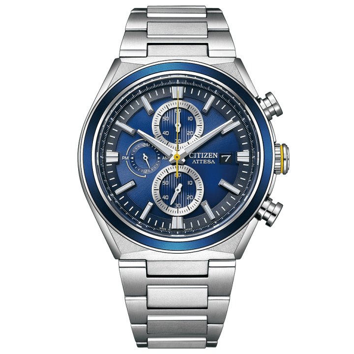 Citizen Attesa ACT Line CA0837-65L - men's watch manufactured by Citizen. It has Japanese solar quartz movement and B612 calibre. Super titanium, duratect treatment case of round shape. Case dimensions are 42 mm. in diameter and 11.6 mm. in thickness. The dial of this Citizen watch is blue. Display type: analog. This timepiece has sapphire, antireflection coating glass. Super titanium band, band color: silver. 100 m. water resistance. The watch is from Attesa collection. The following features are equipped: glowing hands, glowing markers, date, chronograph.