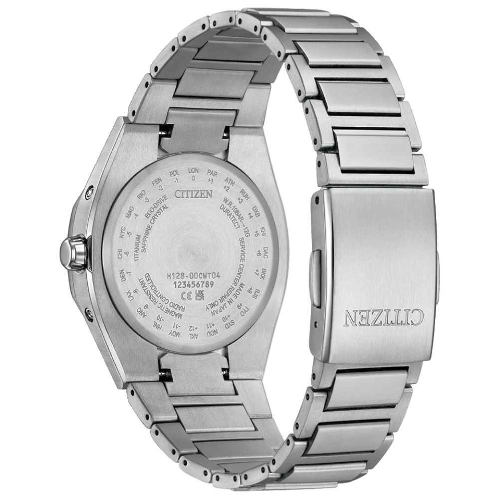 Citizen Attesa ACT Line CB3040-56H - men's watch made by Citizen. It is equipped with Japanese solar quartz movement and H128 calibre. Super titanium, duratect treatment case of round shape. Case dimensions are 39 mm. in diameter and 9.7 mm. in thickness. The dial of this Citizen watch is silver. Display type: analog. This timepiece has sapphire, antireflection coating glass. Super titanium band, band color: silver. 100 m. water resistance. The watch is from Attesa collection. The following features are equipped: radio controlled, antimagnetic, glowing hands, power reserve indicator, perpetual calendar, date, world time.