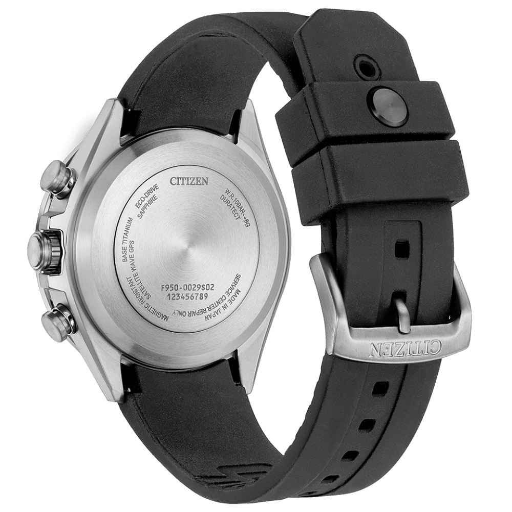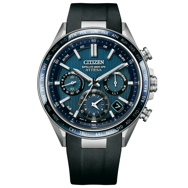 Citizen Attesa ACT Line Satellite Wave GPS CC4050-18L - men's watch made by Citizen. It is equipped with Japanese solar quartz movement and F950 calibre. Super titanium, duratect treatment case of round shape. Case dimensions are 44.6 mm. in diameter and 15.4 mm. in thickness. The dial of this Citizen watch is blue. Display type: analog. This timepiece has sapphire, clarity coating glass. Urethane band, band color: black. 100 m. water resistance. The watch is from Attesa collection. The following features are equipped: gps, antimagnetic, glowing hands, glowing markers, power reserve indicator, date, day, chronograph, world time, dual time, alarm, perpetual calendar.