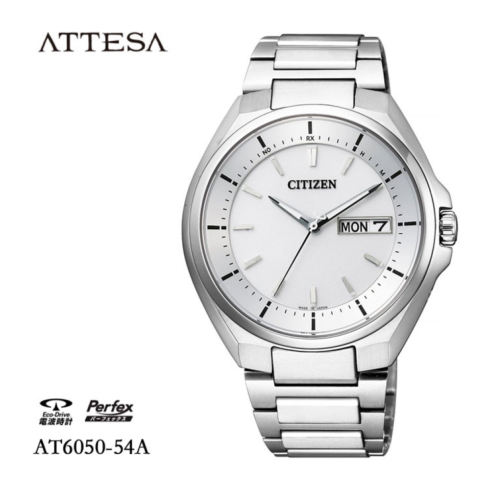 CITIZEN ATTESA AT6050-54A - men's watch manufactured by Citizen. It is equipped with Japanese solar quartz movement and H100 calibre. Titanium, hard coating case of round shape. Case dimensions are 41 mm. in diameter and 9.5 mm. in thickness. The dial of this Citizen watch is white. Display type: analog. This timepiece has sapphire, antireflection coating glass. Titanium, hard coating band, band color: silver. 100 m. water resistance. The watch is from Attesa collection. The following features are equipped: radio controlled, date, day, perpetual calendar, antimagnetic, glowing hands, glowing markers.