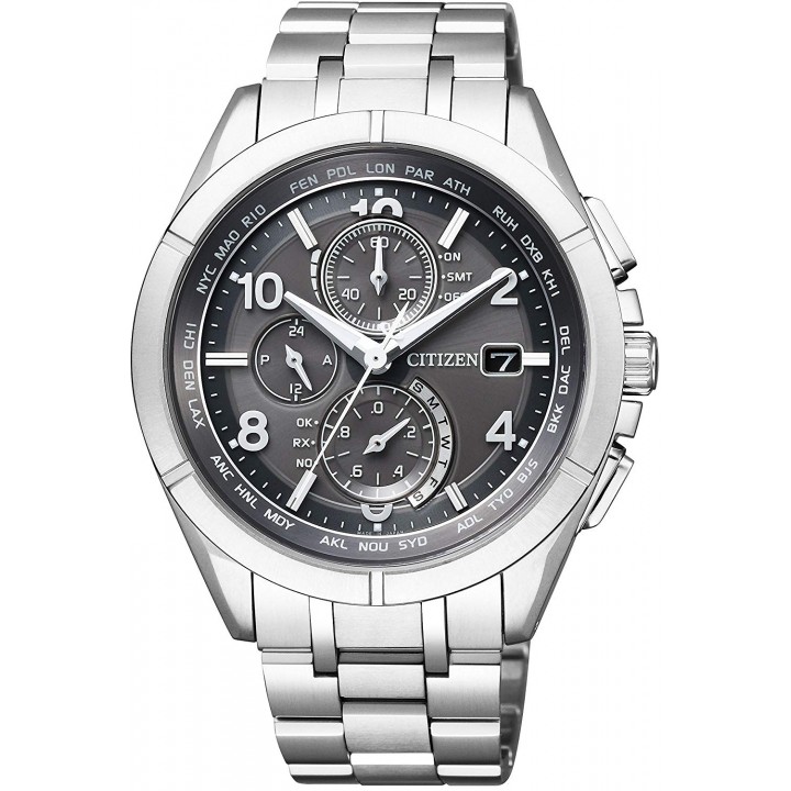 CITIZEN ATTESA AT8160-55H - men's watch produced by Citizen. It is equipped with Japanese solar quartz movement and H800 calibre. Titanium, hard coating case of round shape. Case dimensions are 41.5 mm. in diameter and 9.7 mm. in thickness. The dial of this Citizen watch is gray. Display type: analog. This timepiece has sapphire, super clear coating glass. Titanium, hard coating band, band color: silver. 100 m. water resistance. The watch is from Attesa collection. The following features are equipped: date, day, perpetual calendar, radio controlled, glowing hands, glowing markers, antimagnetic, world time, chronograph, power reserve indicator, limited edition.