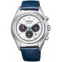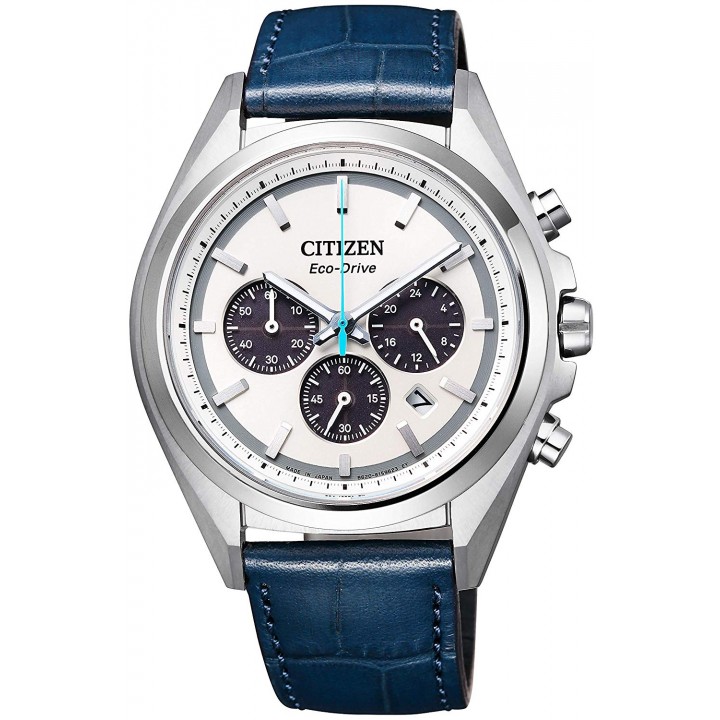CITIZEN ATTESA CA4390-04H - men's watch manufactured by Citizen. It is equipped with Japanese solar quartz movement and B620 calibre. Titanium, hard coating case of round shape. Case dimensions are 41 mm. in diameter and 11.6 mm. in thickness. The dial of this Citizen watch is white. Display type: analog. This timepiece has sapphire, antireflection coating glass. Leather band, band color: blue. 100 m. water resistance. The watch is from Attesa collection. The following features are equipped: date, chronograph, glowing hands.