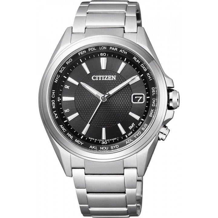 CITIZEN ATTESA CB1070-56E - men's watch manufactured by Citizen. It has Japanese solar quartz movement and H149 calibre. Titanium, hard coating case of round shape. Case dimensions are 42 mm. in diameter and 9.4 mm. in thickness. The dial of this Citizen watch is black. Display type: analog. This timepiece has sapphire, antireflection coating glass. Titanium, hard coating band, band color: silver. 100 m. water resistance. The watch is from Attesa collection. The following features are equipped: radio controlled, power reserve indicator, world time, date, perpetual calendar, antimagnetic, glowing hands, glowing markers.