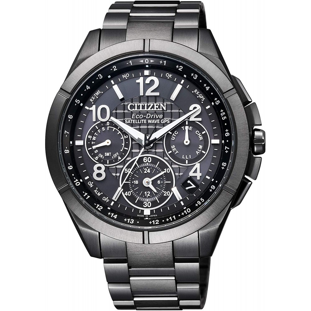 CITIZEN ATTESA GPS CC9075-52F - men's watch made by Citizen. It has Japanese solar quartz movement and F900 calibre. Titanium, hard coating case of round shape. Case dimensions are 43.5 mm. in diameter and 13.1 mm. in thickness. The dial of this Citizen watch is black. Display type: analog. This timepiece has sapphire, super clear coating glass. Titanium, hard coating band, band color: black. 100 m. water resistance. The watch is from Attesa collection. The following features are equipped: gps, date, day, chronograph, alarm, dual time, perpetual calendar, world time, antimagnetic, power reserve indicator, glowing hands, glowing markers.