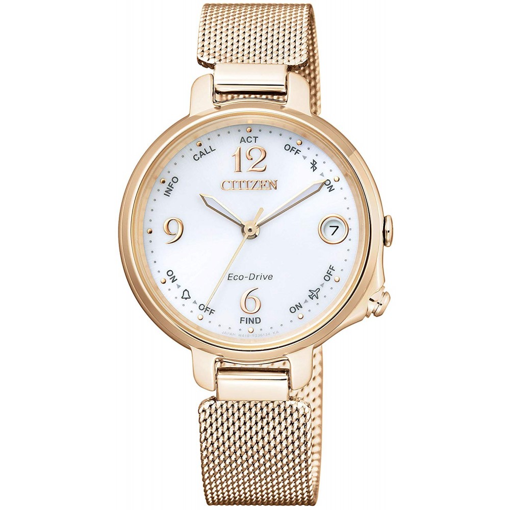 CITIZEN BLUETOOTH EE4035-81A - ladies watch manufactured by Citizen. It has Japanese solar quartz movement and W410 calibre. Stainless steel, gold plated case of round shape. Case dimensions are 33 mm. in diameter and 9.98 mm. in thickness. The dial of this Citizen watch is white. Display type: analog. This timepiece has mineral glass. Stainless steel, gold plated band, band color: gold. 50 m. water resistance. The watch is from Eco-Drive Bluetooth collection. The following features are equipped: altimeter, date, bluetooth, perpetual calendar, world time, alarm.