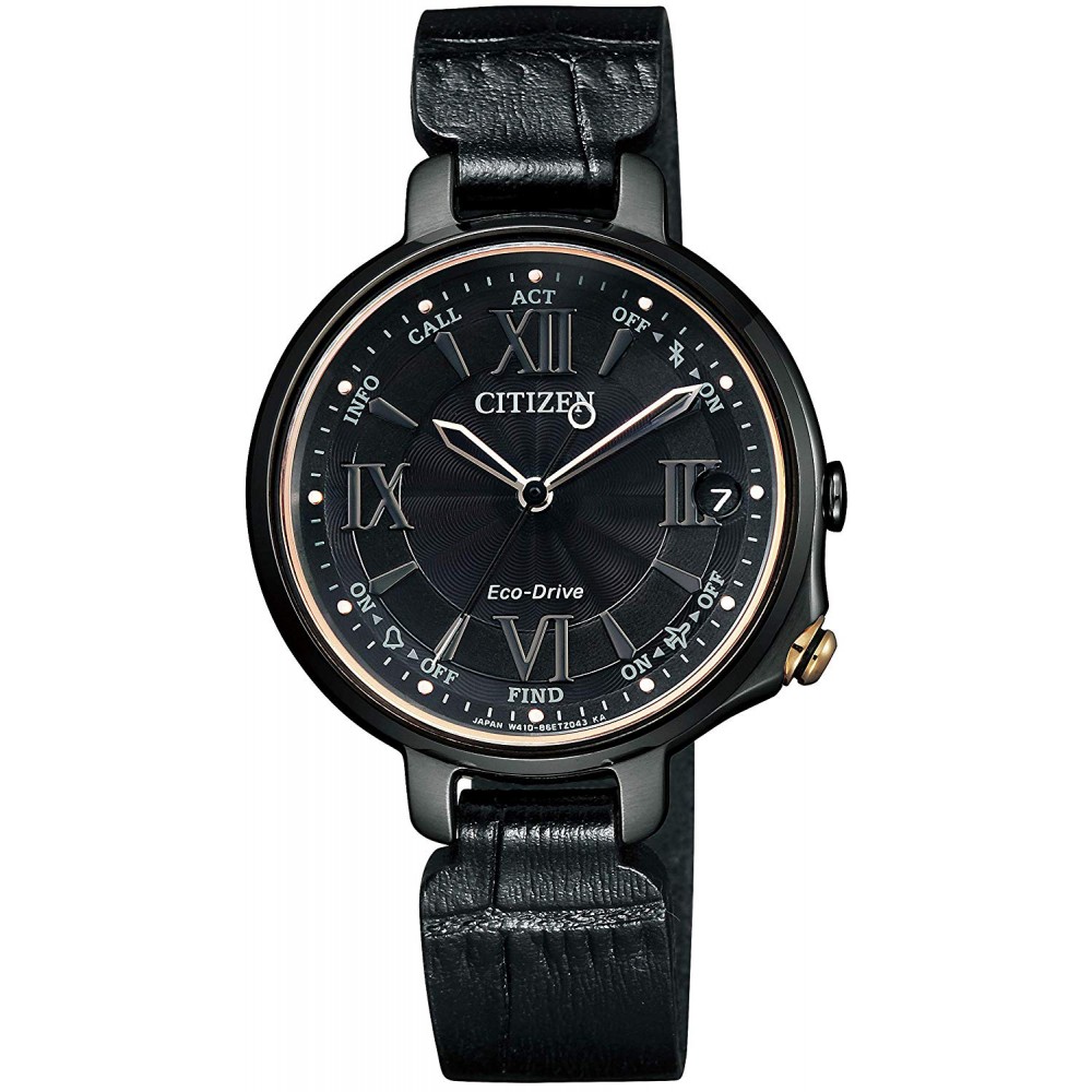 CITIZEN BLUETOOTH EE4058-19E - ladies watch manufactured by Citizen. It is equipped with Japanese solar quartz movement and W410 calibre. Stainless steel, hard coating case of round shape. Case dimensions are 33 mm. in diameter and 9.98 mm. in thickness. The dial of this Citizen watch is black. Display type: analog. This timepiece has mineral glass. Leather band, band color: black. 50 m. water resistance. The watch is from Eco-Drive Bluetooth collection. The following features are equipped: antimagnetic, alarm, date, perpetual calendar, bluetooth, world time, power reserve indicator, limited edition.
