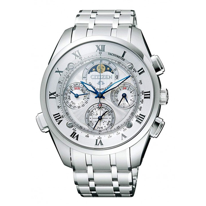 Citizen Campanola Complication Grand Complication CTR57-0991 - men's watch made by Citizen. It is equipped with Japanese quartz movement and 6772 calibre. Stainless steel, hard coating case of round shape. Case dimensions are 43 mm. in diameter and 16.5 mm. in thickness. The dial of this Citizen watch is silver. Display type: analog. This timepiece has sapphire, antireflection coating glass. Stainless steel, hard coating band, band color: silver. 30 m. water resistance. The watch is from Campanola collection. The following features are equipped: date, day, month, chronograph, moon phase, perpetual calendar, repeater.