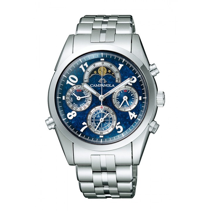 Citizen Campanola Complication Grand Complication CTR57-1101 - men's watch produced by Citizen. It is equipped with Japanese quartz movement and 6771 calibre. Stainless steel, hard coating case of round shape. Case dimensions are 38 mm. in diameter and 16.2 mm. in thickness. The dial of this Citizen watch is blue. Display type: analog. This timepiece has sapphire, antireflection coating glass. Stainless steel, hard coating band, band color: silver. 30 m. water resistance. The watch is from Campanola collection. The following features are equipped: date, day, month, chronograph, moon phase, perpetual calendar, repeater.