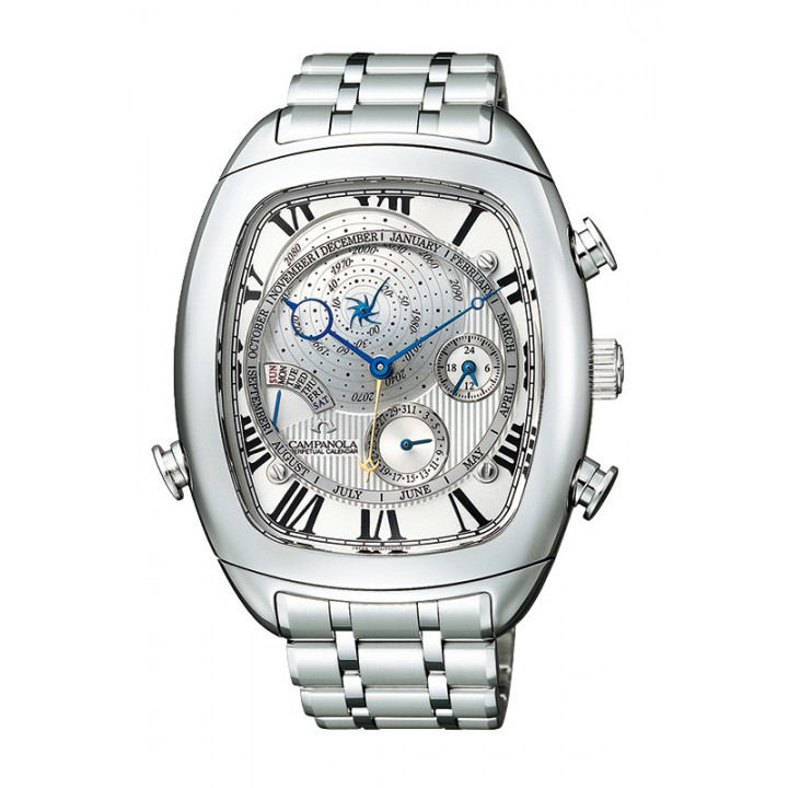 Citizen Campanola Complication Perpetual Calendar AG6250-50A - men's watch produced by Citizen. It is equipped with Japanese quartz movement and 6704 calibre. Stainless steel case of tonneau shape. Case dimensions are 41 mm. in diameter and 15.7 mm. in thickness. The dial of this Citizen watch is silver, white. Display type: analog. This timepiece has sapphire, antireflection coating glass. Stainless steel band, band color: silver. 30 m. water resistance. The watch is from Campanola collection. The following features are equipped: date, day, month, perpetual calendar.