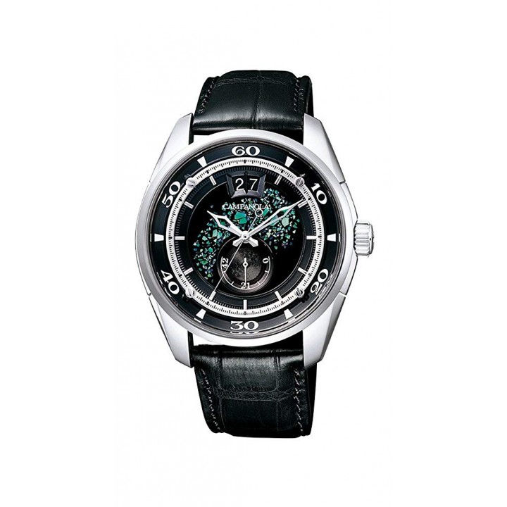 Citizen Campanola Mechanical Collection NZ0000-07F - men's watch made by Citizen. It has Japanese automatic movement and Y513 calibre. Stainless steel case of round shape. Case dimensions are 42 mm. in diameter and 14 mm. in thickness. The dial of this Citizen watch is black, green. Display type: analog. This timepiece has sapphire, super clear coating glass. Crocodile leather band, band color: black. 30 m. water resistance. The watch is from Campanola collection. The following features are equipped: date, power reserve indicator.