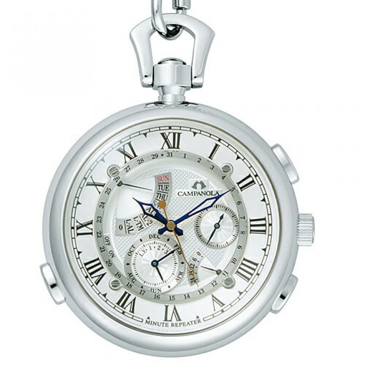 Citizen Campanola Minute Repeater Pocket CTR57-1181 - men's watch manufactured by Citizen. It is equipped with Japanese quartz movement and 6762 calibre. Stainless steel case of round shape. Case dimensions are 47 mm. in diameter and 16.1 mm. in thickness. The dial of this Citizen watch is silver. Display type: analog. This timepiece has sapphire, antireflection coating glass. Stainless steel band, band color: silver. 30 m. water resistance. The watch is from Campanola collection. The following features are equipped: date, day, month, perpetual calendar, repeater, alarm, dual time.