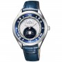 Citizen Campanola Moon Phase EZ2000-06B - ladies watch made by Citizen. It is equipped with Japanese quartz movement and 6324 calibre. Stainless steel case of round shape. Case dimensions are 36 mm. in diameter and 10.1 mm. in thickness. The dial of this Citizen watch is silver, blue. Display type: analog. This timepiece has sapphire, super clear coating glass. Crocodile leather band, band color: blue. 30 m. water resistance. The watch is from Campanola collection. The following features are equipped: moon phase.