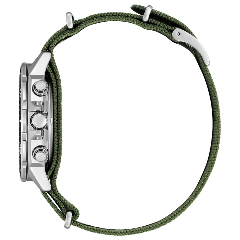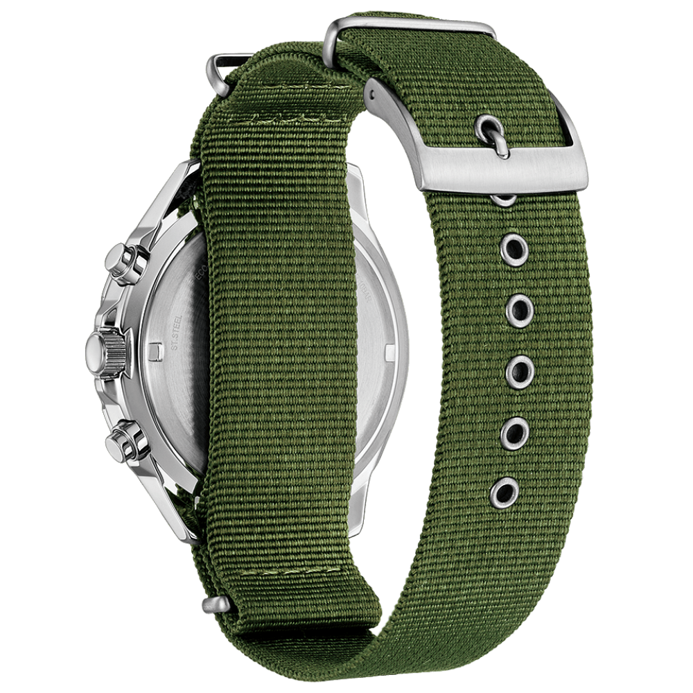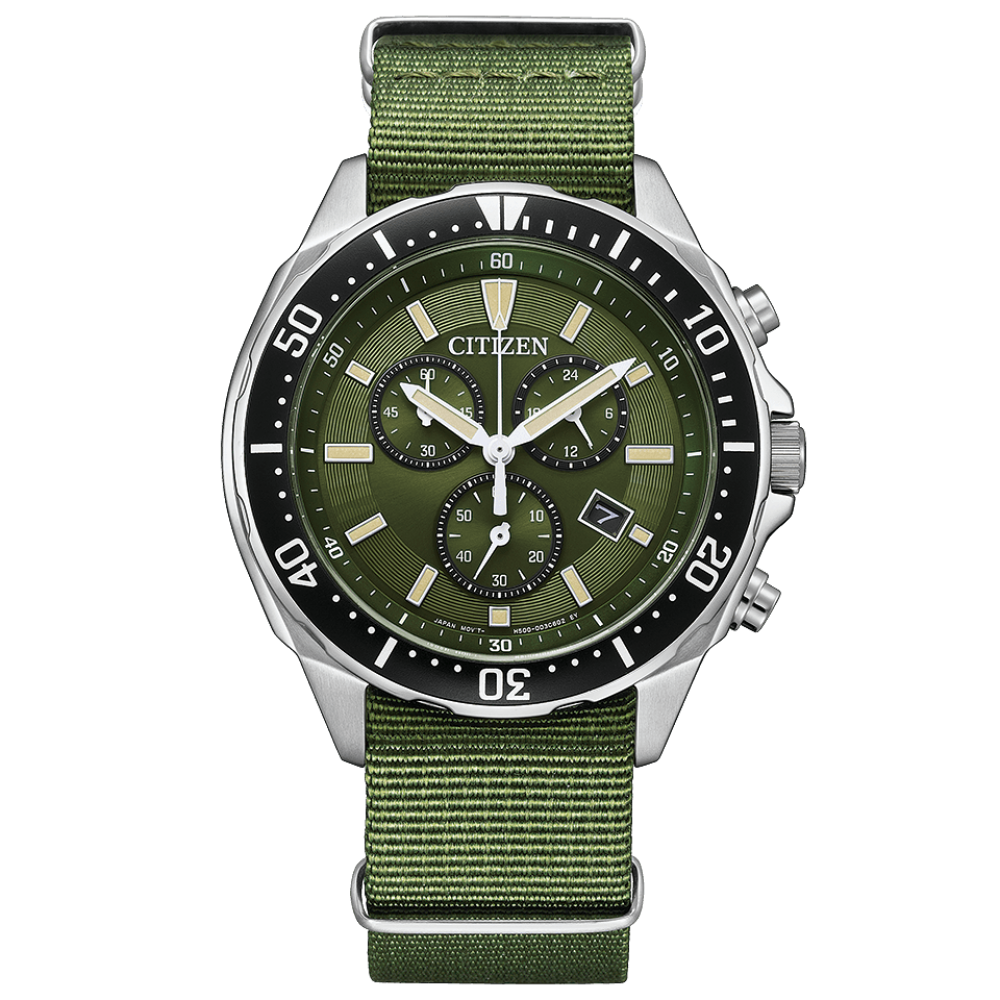 Citizen Collection AT2500-19W - men's watch made by Citizen. It is equipped with Japanese solar quartz movement and H500 calibre. Stainless steel case of round shape. Case dimensions are 40.6 mm. in diameter and 11 mm. in thickness. The dial of this Citizen watch is khaki, green. Display type: analog. This timepiece has mineral glass. Nylon band, band color: khaki, green. 100 m. water resistance. The watch is from Citizen Collection collection. The following features are equipped: glowing hands, glowing markers, date, chronograph.