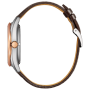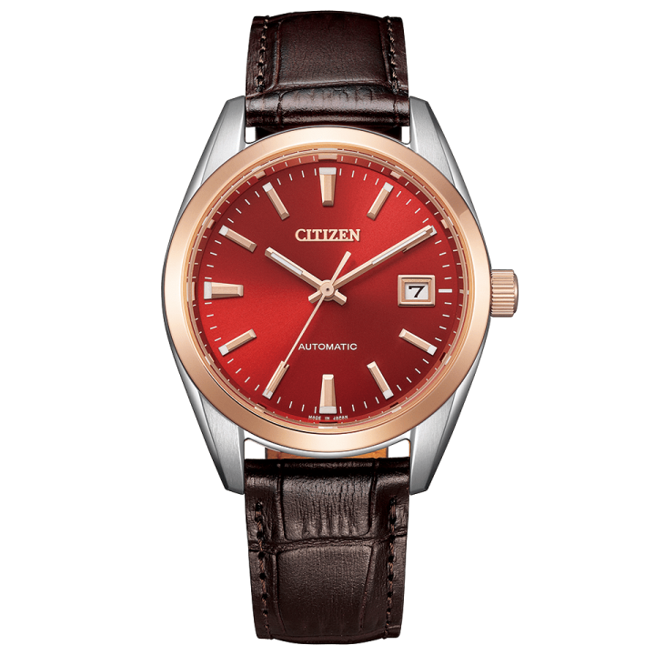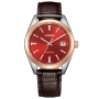 Citizen Collection Automatic NB1055-04W - men's watch made by Citizen. It has Japanese automatic movement and 9011 calibre. Stainless steel, gold plated case of round shape. Case dimensions are 38 mm. in diameter and 10.5 mm. in thickness. The dial of this Citizen watch is red. Display type: analog. This timepiece has sapphire, antireflection coating glass. Calf leather band, band color: brown. 100 m. water resistance. The watch is from Citizen Collection collection. The following features are equipped: glowing hands, date, glowing markers.