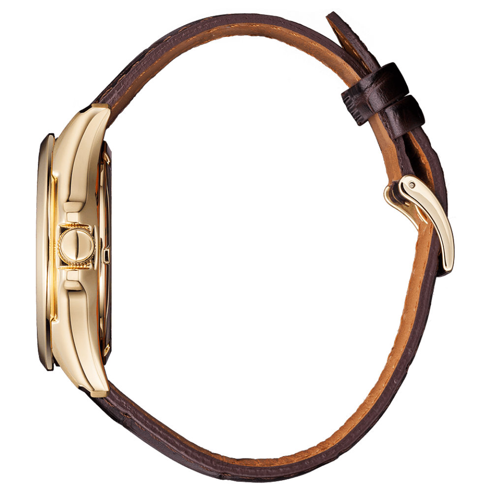 Citizen Collection Automatic NP1013-02P - men's watch manufactured by Citizen. It is equipped with Japanese automatic movement and 4197 calibre. Stainless steel, gold plated case of round shape. Case dimensions are 38.9 mm. in diameter and 11.2 mm. in thickness. The dial of this Citizen watch is silver. Display type: analog. This timepiece has sapphire glass. Calf leather band, band color: brown. 100 m. water resistance. The watch is from Citizen Collection collection.