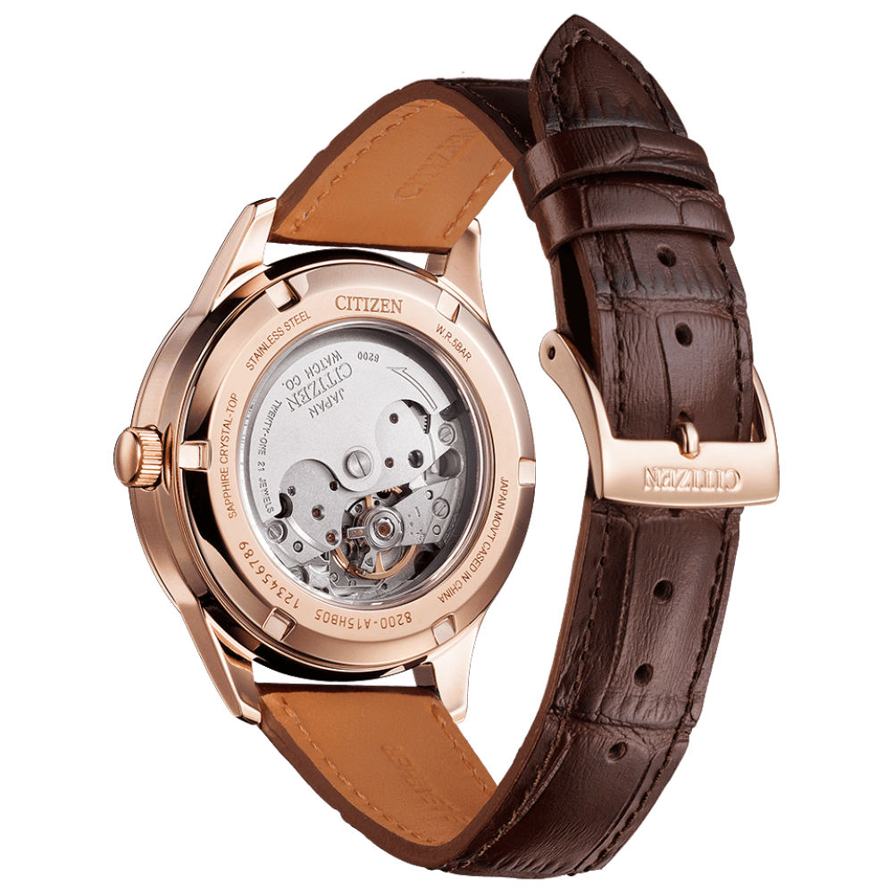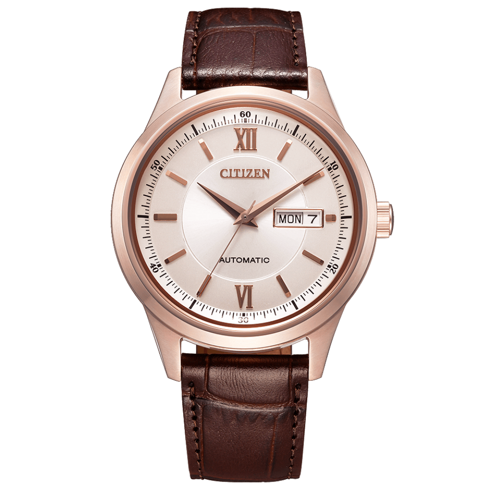 Citizen Collection Automatic NY4052-16A - men's watch produced by Citizen. It has Japanese automatic movement and 8200 calibre. Stainless steel, gold plated case of round shape. Case dimensions are 40 mm. in diameter and 10.7 mm. in thickness. The dial of this Citizen watch is gold. Display type: analog. This timepiece has sapphire glass. Calf leather band, band color: brown. 50 m. water resistance. The watch is from Citizen Collection collection. The following features are equipped: date, day.