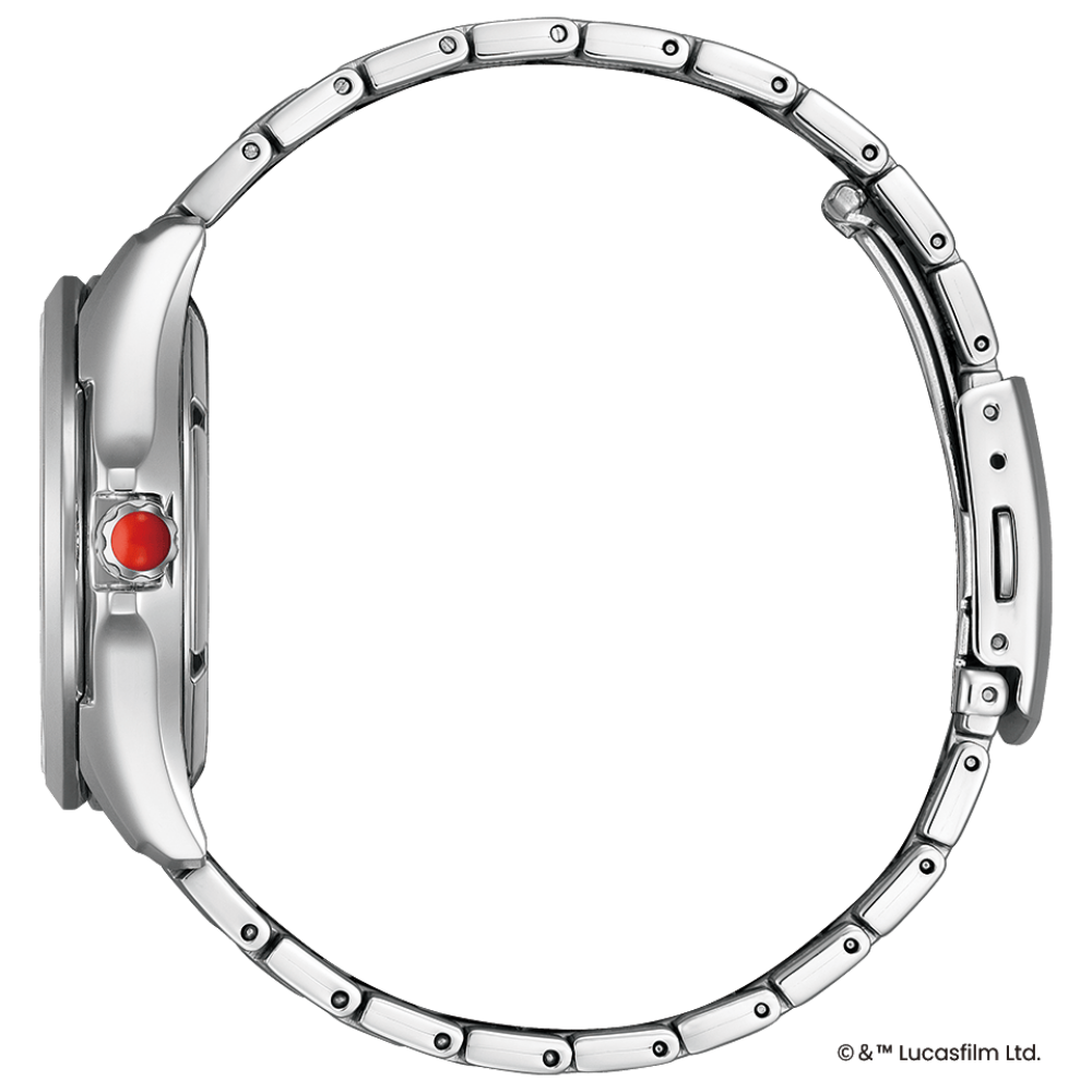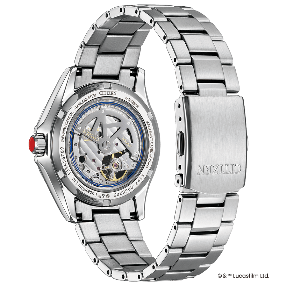 Citizen Collection Automatic STAR WARS R2-D2 Limited Edition NP1017-61A - men's watch made by Citizen. It has Japanese automatic movement and 4197 calibre. Stainless steel case of round shape. Case dimensions are 38.9 mm. in diameter and 11.2 mm. in thickness. The dial of this Citizen watch is silver. Display type: analog. This timepiece has sapphire glass. Stainless steel band, band color: silver. 100 m. water resistance. The watch is from Citizen Collection collection. The following features are equipped: limited edition.