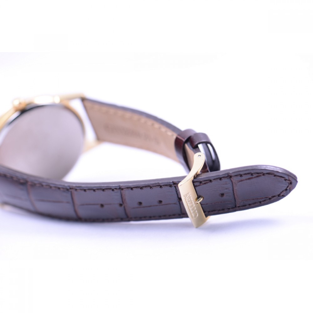 CITIZEN COLLECTION AW1232-21L - men's watch produced by Citizen. It has Japanese solar quartz movement and J810 calibre. Stainless steel, gold plated case of round shape. Case dimensions are 40 mm. in diameter and 9.2 mm. in thickness. The dial of this Citizen watch is blue. Display type: analog. This timepiece has mineral glass. Leather band, band color: brown. 30 m. water resistance. The watch is from Citizen Collection collection. The following features are equipped: date.