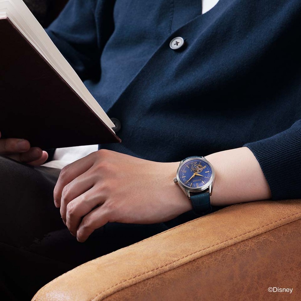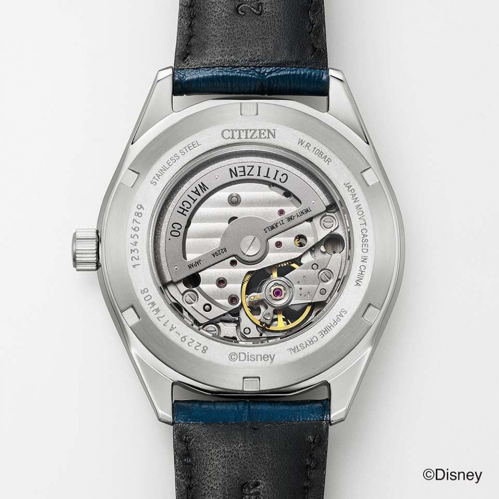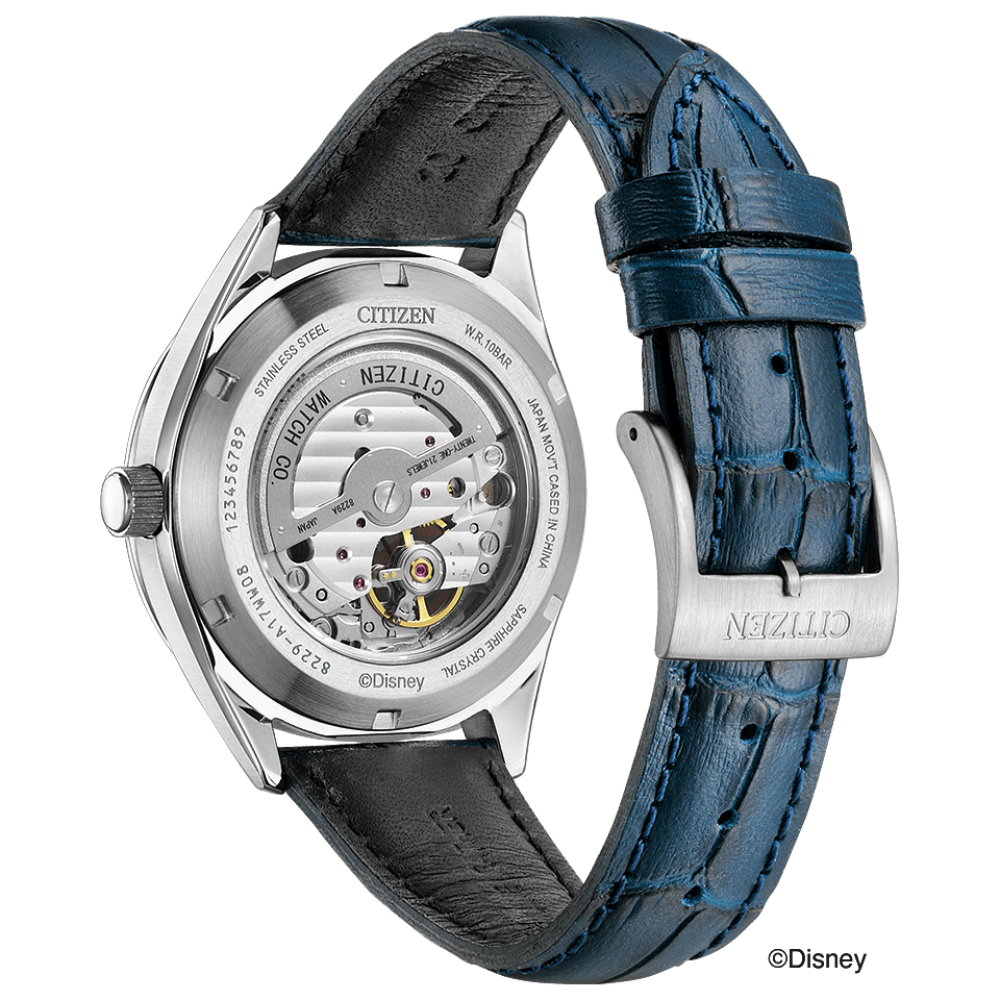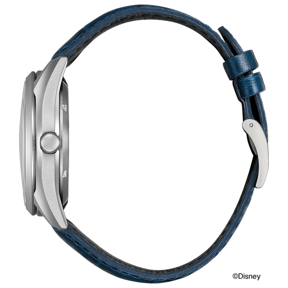 Citizen Collection Disney Collection Limited Edition NH9115-02L - men's watch made by Citizen. It has Japanese automatic movement and 8229 calibre. Stainless steel case of round shape. Case dimensions are 40 mm. in diameter and 12.9 mm. in thickness. The dial of this Citizen watch is blue. Display type: analog. This timepiece has sapphire glass. Cowhide leather band, band color: navy. 100 m. water resistance. The watch is from Citizen Collection collection. The following features are equipped: limited edition.