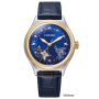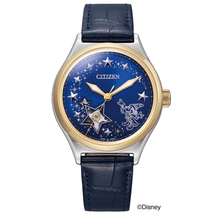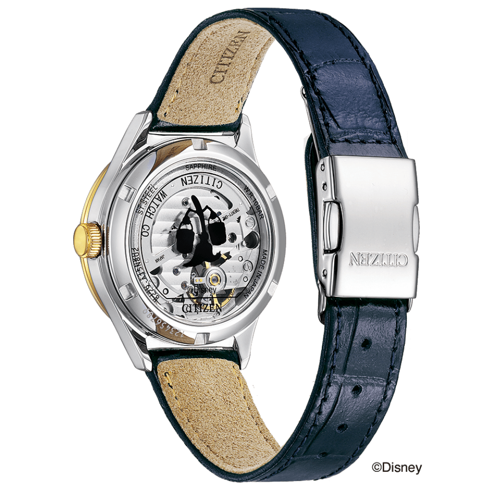 Citizen Collection Disney Collection Limited Edition PC1005-01L - ladies watch manufactured by Citizen. It has Japanese automatic movement and 8229 calibre. Stainless steel, gold plated case of round shape. Case dimensions are 34 mm. in diameter and 11.1 mm. in thickness. The dial of this Citizen watch is navy. Display type: analog. This timepiece has sapphire glass. Calf leather band, band color: navy. 100 m. water resistance. The watch is from Citizen Collection collection. The following features are equipped: limited edition.