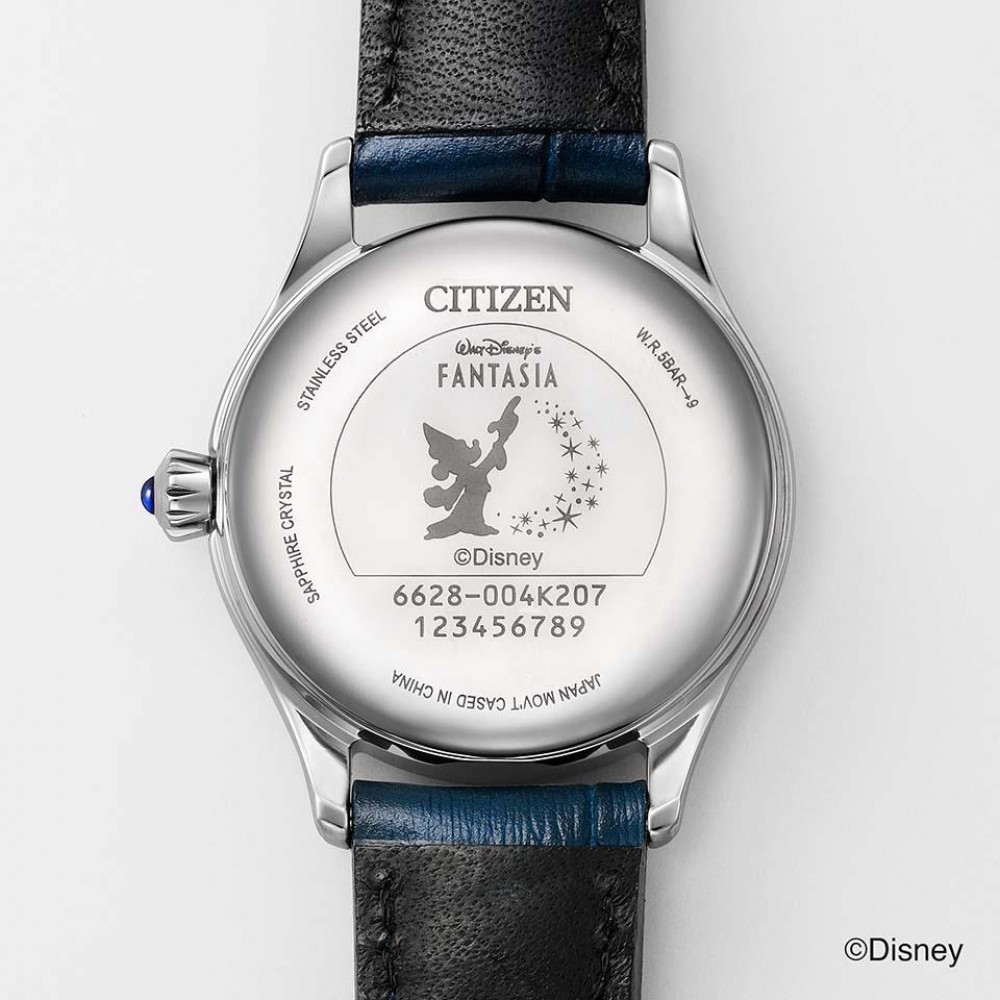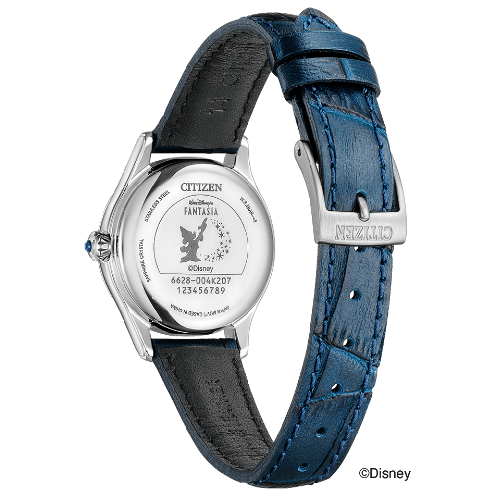 Citizen Collection Disney Collection Limited Edition PR1040-02L - ladies watch produced by Citizen. It has Japanese automatic movement and 6628 calibre. Stainless steel case of round shape. Case dimensions are 28.5 mm. in diameter and 9.9 mm. in thickness. The dial of this Citizen watch is blue. Display type: analog. This timepiece has sapphire glass. Cowhide leather band, band color: navy. 50 m. water resistance. The watch is from Citizen Collection collection. The following features are equipped: limited edition.