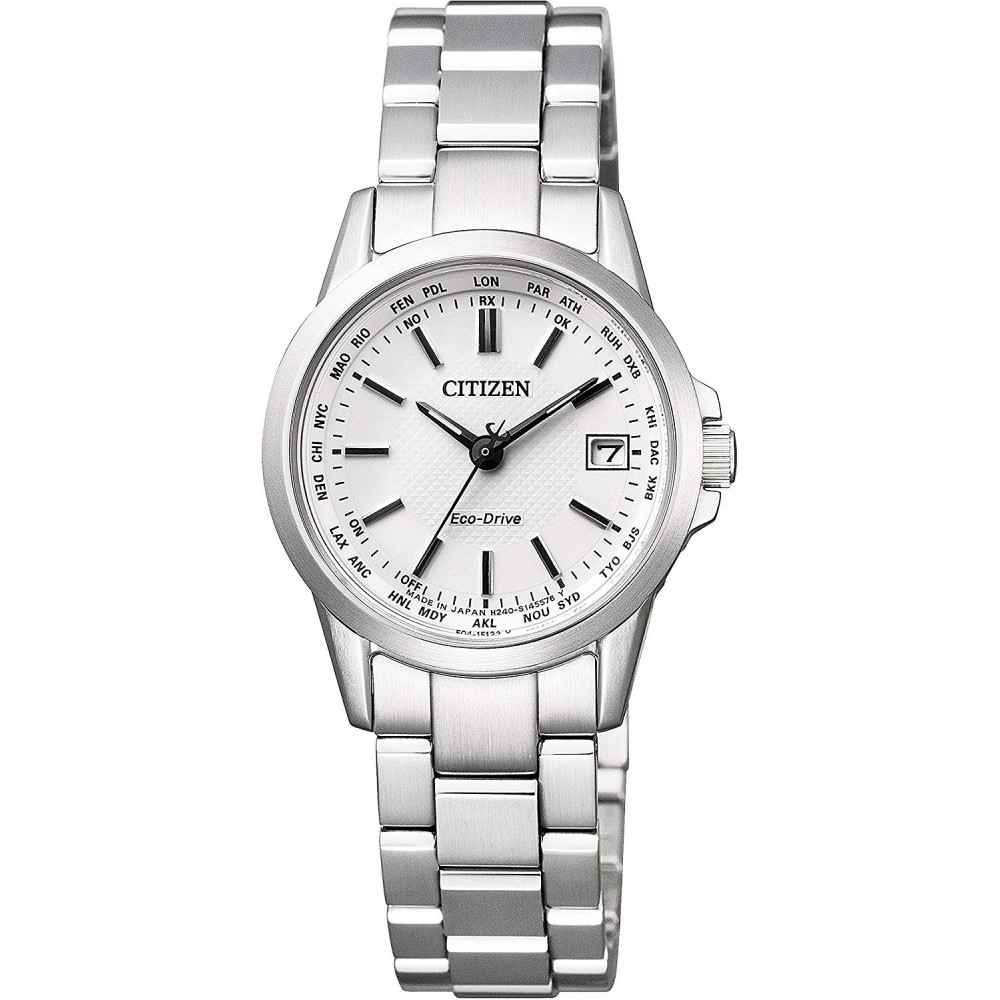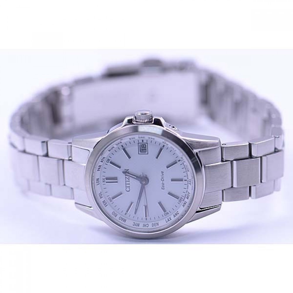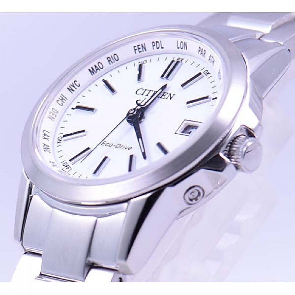CITIZEN COLLECTION EC1130-55A - ladies watch produced by Citizen. It is equipped with Japanese solar quartz movement and H240 calibre. Stainless steel case of round shape. Case dimensions are 27.6 mm. in diameter and 8.1 mm. in thickness. The dial of this Citizen watch is white. Display type: analog. This timepiece has sapphire glass. Stainless steel band, band color: silver. 100 m. water resistance. The watch is from Citizen Collection collection. The following features are equipped: antimagnetic, date, perpetual calendar, radio controlled, world time.