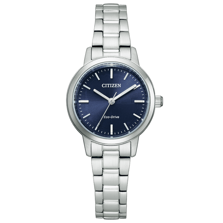 CItizen Collection EM0930-58L - ladies watch made by Citizen. It is equipped with Japanese solar quartz movement and E031 calibre. Stainless steel case of round shape. Case dimensions are 27 mm. in diameter and 7.5 mm. in thickness. The dial of this Citizen watch is blue. Display type: analog. This timepiece has mineral glass. Stainless steel band, band color: silver. 50 m. water resistance. The watch is from Citizen Collection collection. The following features are equipped: glowing hands, glowing markers.