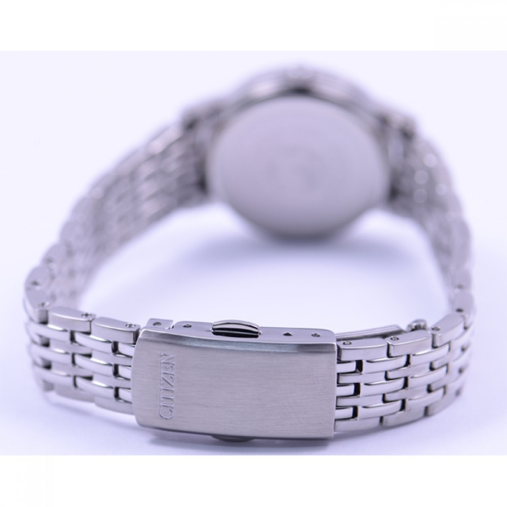 CITIZEN COLLECTION EW3250-53A - ladies watch produced by Citizen. It has Japanese solar quartz movement and E001 calibre. Stainless steel case of round shape. Case dimensions are 27 mm. in diameter and 7.5 mm. in thickness. The dial of this Citizen watch is white. Display type: analog. This timepiece has sapphire glass. Stainless steel band, band color: silver. 30 m. water resistance. The watch is from Citizen Collection collection. The following features are equipped: date, day.
