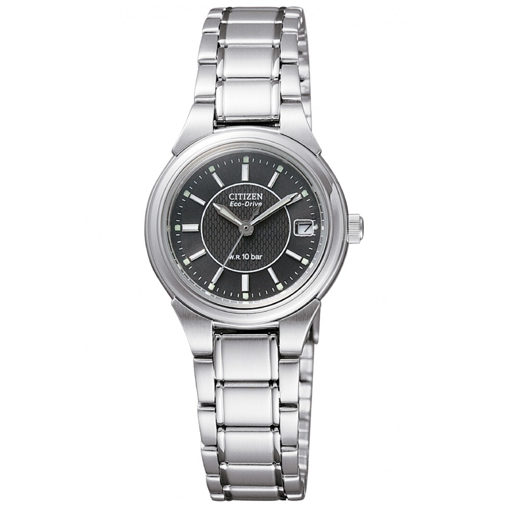 Citizen Collection FRA36-2201 - ladies watch made by Citizen. It has Japanese solar quartz movement and E011 calibre. Stainless steel case of round shape. Case dimensions are 25.3 mm. in diameter and 8.7 mm. in thickness. The dial of this Citizen watch is black. Display type: analog. This timepiece has mineral glass. Stainless steel band, band color: silver. 100 m. water resistance. The watch is from Citizen Collection collection. The following features are equipped: date, antimagnetic, glowing hands, glowing markers.